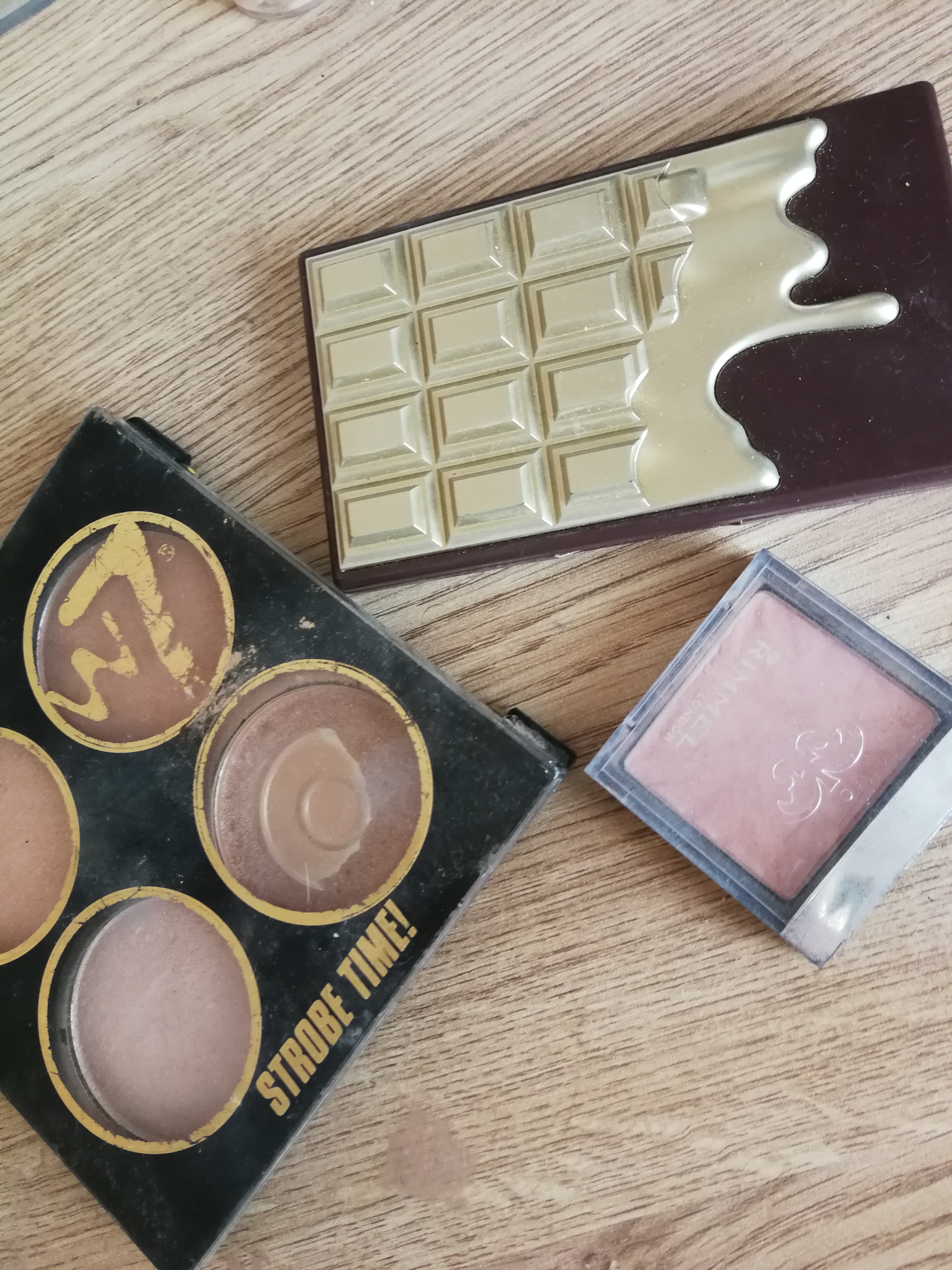 For the rest of my face I tend to use just a bit of blusher and highlighter for everyday.  The photograph shows a few of my faves.  If I am staying at Ste’s or away somewhere I tend to take my Primark PS Chocolate Cheek Palette as it has a couple of blush colours and a highlighter so I don’t need to take as many products with me.  Thy also smell of chocolate which is a heavenly bonus!