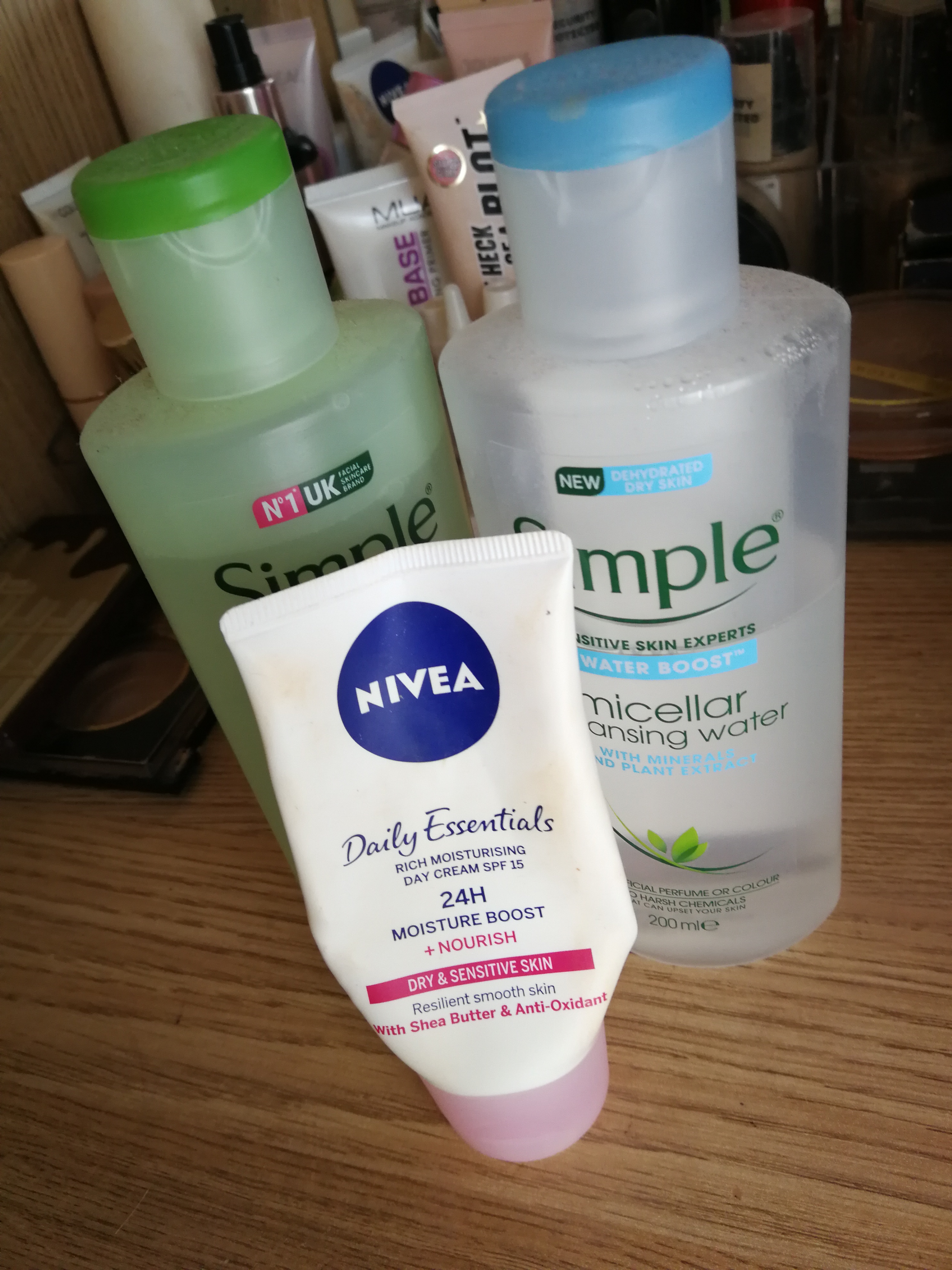 My favourite skincare products have been from Nivea and Simple and this has been the case for many years.  I will take off my make up in the evening and so in the morning will generally just use  a cleansing wipe or my Simple Micellar Water and Toner.  I know cleansing wipes are not the best thing to use but they are great for convenience, for taking with me when travelling or staying at Ste’s and as I do a proper skincare routine in the evening to remove my make up, I don’t think I need to worry too much about using them in the morning. I generally purchase my cotton wool pads from Primark as they are nice and cheap, and will often get my cleansing wipes from there too.  I tend to use the moisturiser pictured from Nivea which is super hydrating and always leaves my skin feeling well moisturised.  Ut also contains an SPF which is important for me, particularly in this weather,.  Some of the medication I use can make your skin more sensitive to the sun.  Although I do not seem to suffer with that, I like to make sure I stay protected anyway.