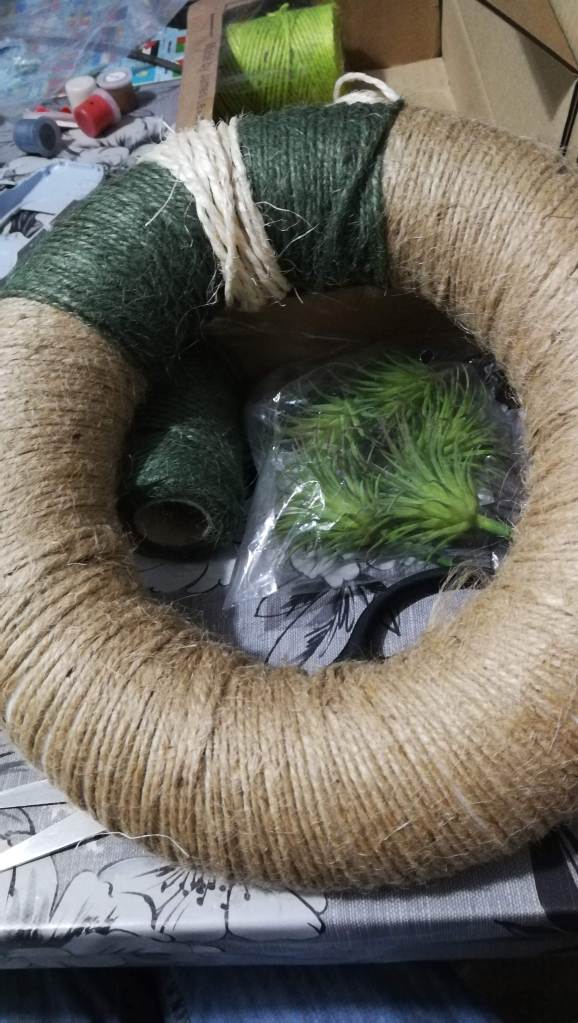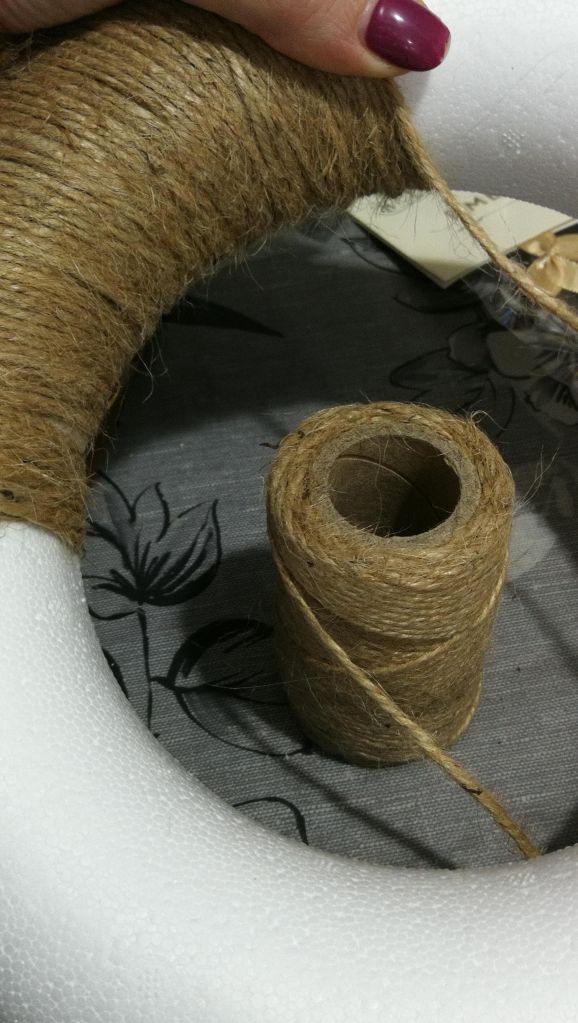 These polystyrene rings are available in a range of sizes and I picked my up from Hobbycraft. I started by using the twine to wrap the ring to create a perfect Autumn coloured, natural looking base. I absolutely loved the colours available and I created a little pattern to make it look a bit different than being one solid block of colour.