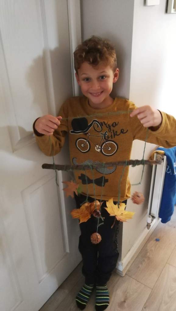 After we had visited Thoresby Park for their Halloween trail we came home with a range of bits we had collected in the forest including some leaves and conkers. Riley had also picked up a large stick which he really liked and said he wanted to use it to make something with.