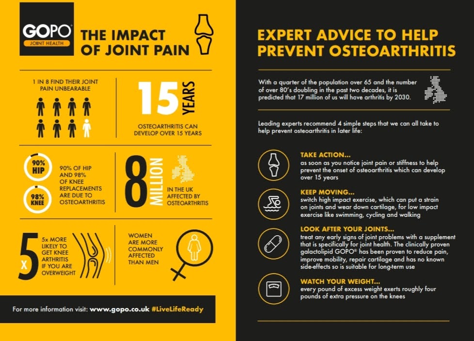 This is great infographic from GOPO which shares some of the impacts of joint pain as well as some expert tips to prevent osteoarthritis. Osteoarthritis is slightly different to rheumatoid arthritis. Rheumatoid arthritis is an autoimmune condition which means your body’s own immune system is attacking itself. Osteoarthritis can affect anyone and is the type often found in older people, where your joints have basically become damaged and worn out from years of being used. Although rheumatoid arthritis can come with additional issues, taking care of your joints is important for everyone to help stop the development of osteoarthritis.