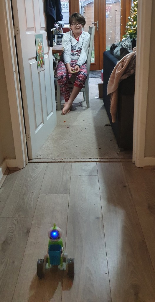 We had great fun testing out all the features and recording our voices on him! Luna, our dog was also super interested in him, and enjoyed following him around while Leo used the remote control to make him move. We found the controls really easy to use and he had no trouble moving on our carpet and wooden floors. We didn’t get chance to try this at the weekend, but are planning to make an obstacle course to test him out on, which Leo is super excited about – I am definitely going to need to get some more driving practice in while he is at school this week!