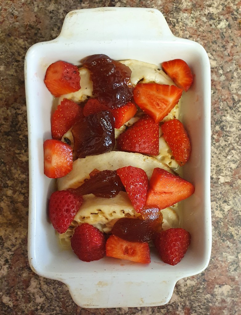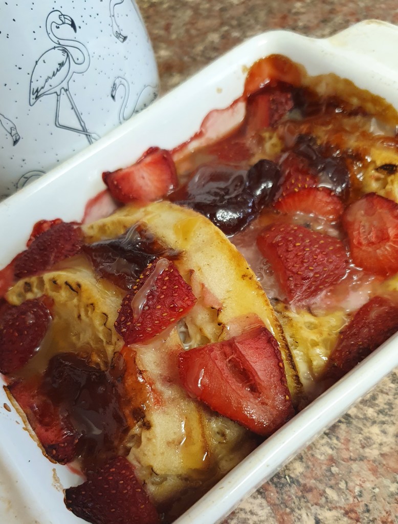 I think next time, to make this extra autumnal, I will add half a teaspoon of cinnamon to the egg mix and rather than sauce, sprinkle on a little cinnamon sugar. This will serve one but it is super easy to double or even triple up if you are making it for a family. It is also one kids could definitely help with, with some supervision/help with the cutting of the strawberries and using the oven depending on their age.